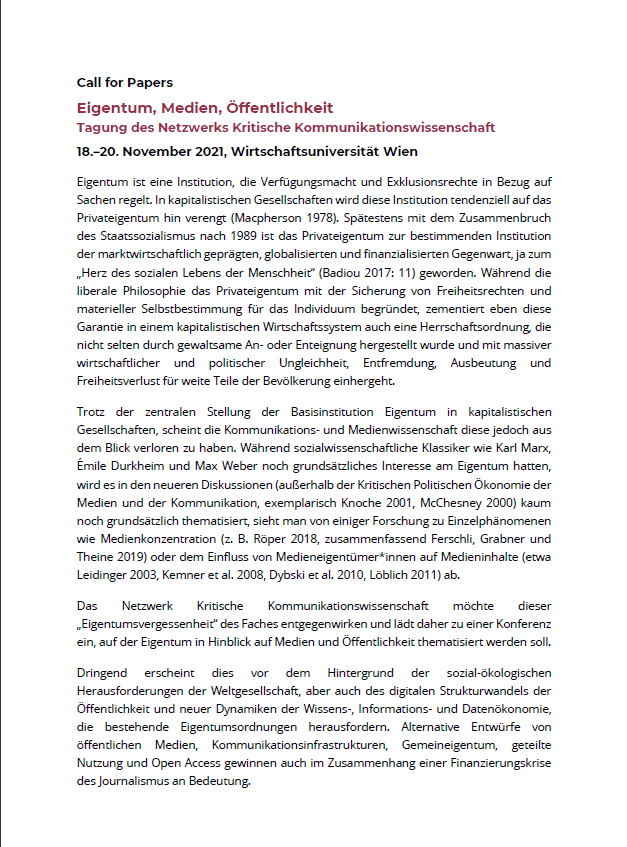 Das Netzwerk Kritische Kommunikationswissenschaft möchte dieser „Eigentumsvergessenheit“ des Faches entgegenwirken und lädt daher zu einer Konferenz ein, auf der Eigentum in Hinblick auf Medien und Öffentlichkeit thematisiert werden soll.