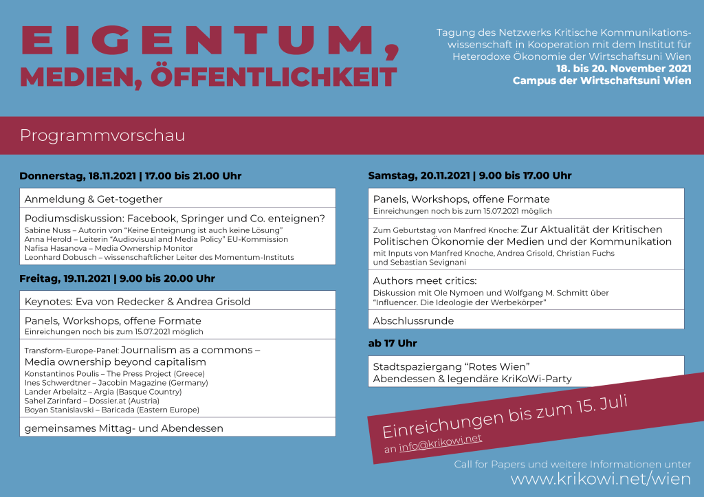 Wir sind inzwischen mehr als optimistisch, dass unsere 4. KriKoWi-Tagung „Eigentum, Medien, Öffentlichkeit“ tatsächlich wie geplant stattfinden kann: analog vom 18. bis 20. November 2021 an der WU Wien.