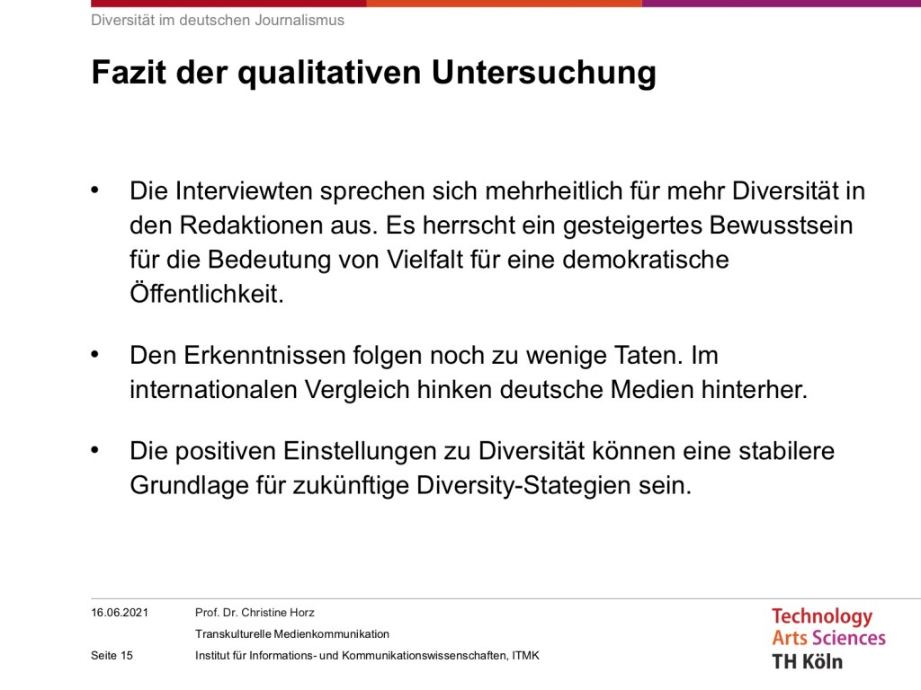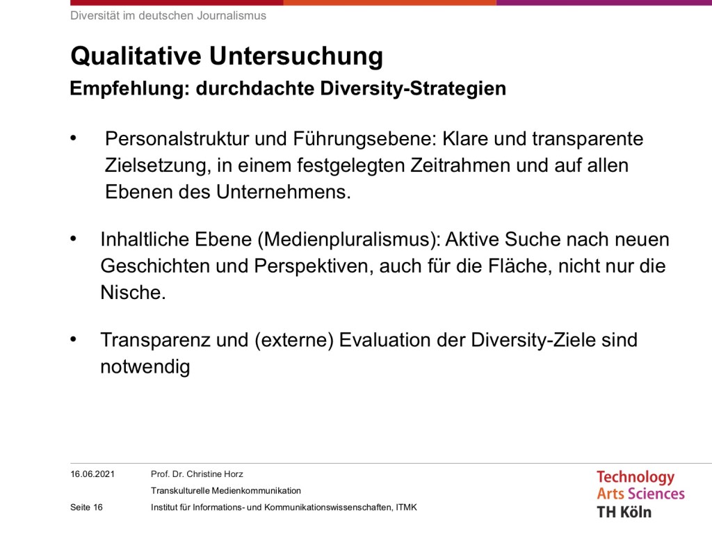 Die Befunde bisheriger Forschung verdeutlichen: Mit Diversität sieht es auf allen Ebenen richtig mies aus. Ihre Umfragen und Einzelinterviews aus dem Jahr 2019 zeigten aber: „Medienverantwortliche begreifen Diversität als Normalität“, das sei „positiv“ und „mutmachend“. Auch die hohe Rücklaufquote bei der neuen Studie spräche für einen Wandel, für mehr Awareness.