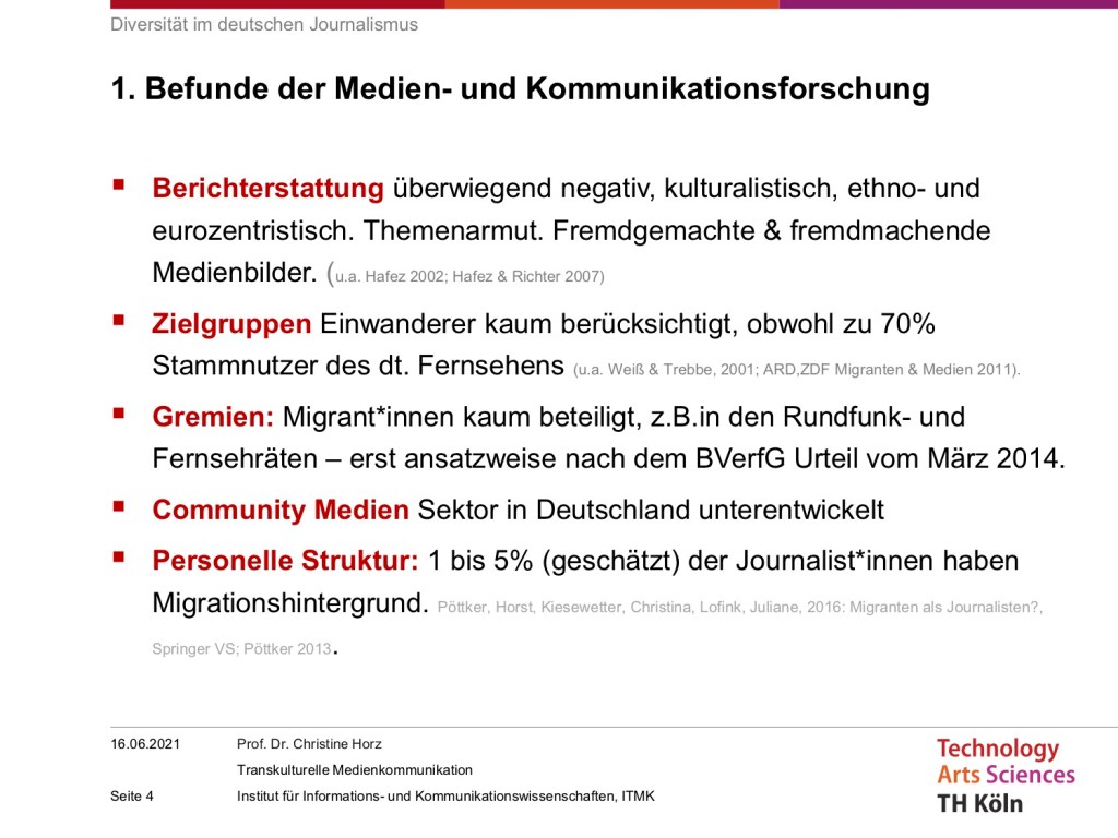Weiterhin zeigte sich, dass es (noch) komplizierter wird, wenn es um den Inhalt geht: Sorgen von Rassismus betroffene Medienschaffende automatisch für eine rassismuskritische Berichterstattung? Wird die Bild aufgrund einer Frau an der (Co-)Spitze weniger sexistisch? Nein, stellte Horz-Ishak klar. Ihre Befragten sähen zwar einen Zusammenhang zwischen der Pluralisierung der Redaktionen und der Pluralisierung der Themen. Es gäbe aber keine Hinweise darauf, dass die Inhalte durch Repräsentation automatisch weniger diskriminierend sind.