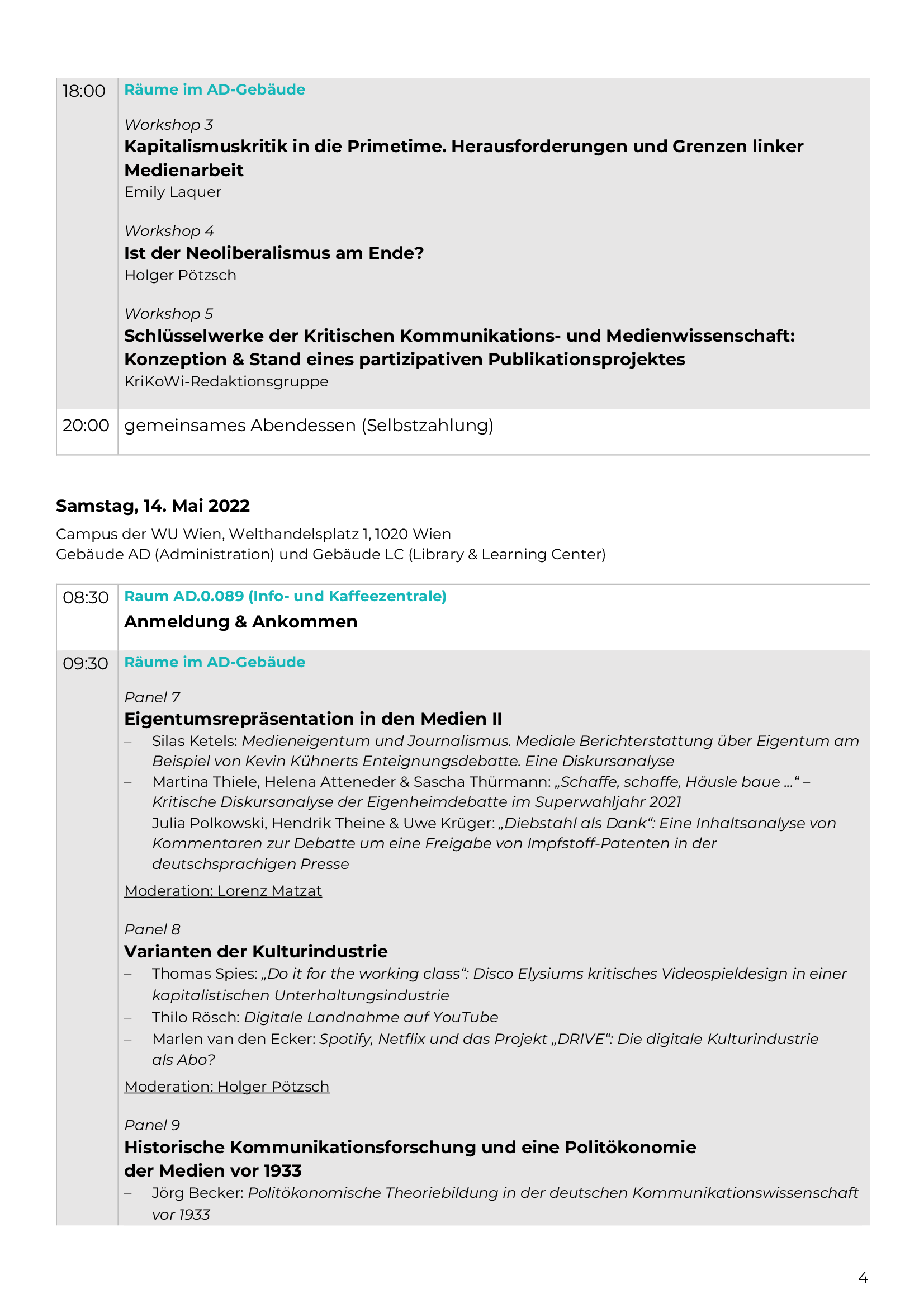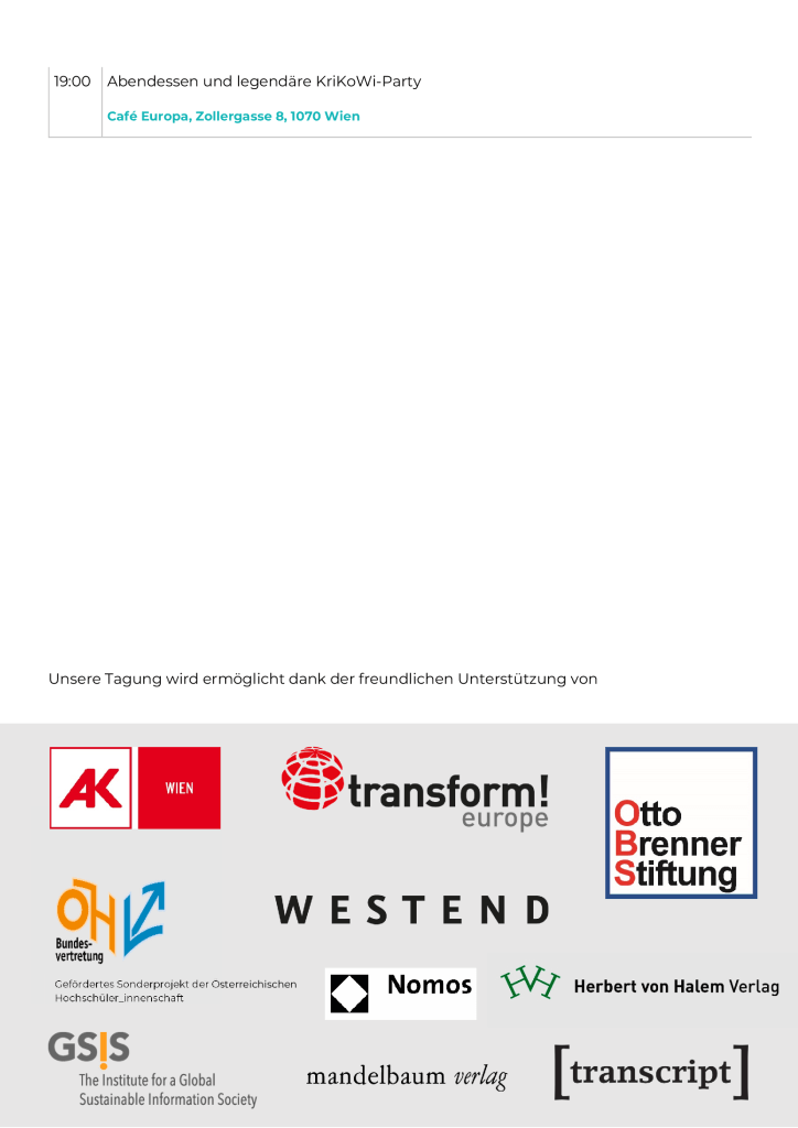 Änderungen finden ihr jeweils auf der Tagungsseite www.krikowi.net/wien. Ein ausgedrucktes Programmheft, das auf dem letzten Stand sein wird, werden wir zu Tagungsbeginn am 12. Mai für alle Teilnehmenden parat haben.