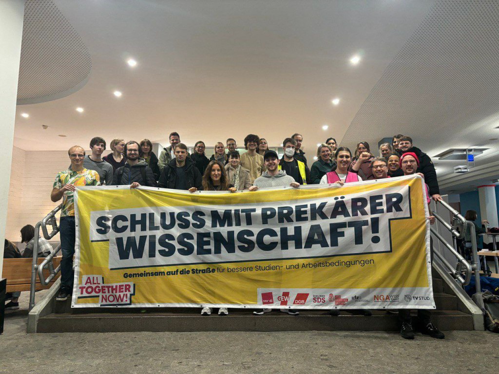 Heute heißt es: „Schluss mit prekärer Wissenschaft!“ Wir setzen uns für ein Ende der prekären Arbeits- und Studienbedingungen ein. KriKoWis sind mit dabei!