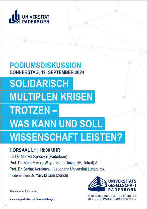 „Solidarisch multiplen Krisen trotzen – Was kann und soll Wissenschaft leisten?“ ist Auftaktveranstaltung unserer diesjährigen Tagung, die vom 19.-21.09 an der Universität Paderborn stattfindet. Die Podiumsdiskussion findet am Donnerstag, dem 19.09.2024, von 18.00 bis 20.00 Uhr statt. (Ort: Hörsaal L1)